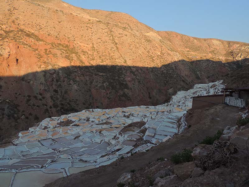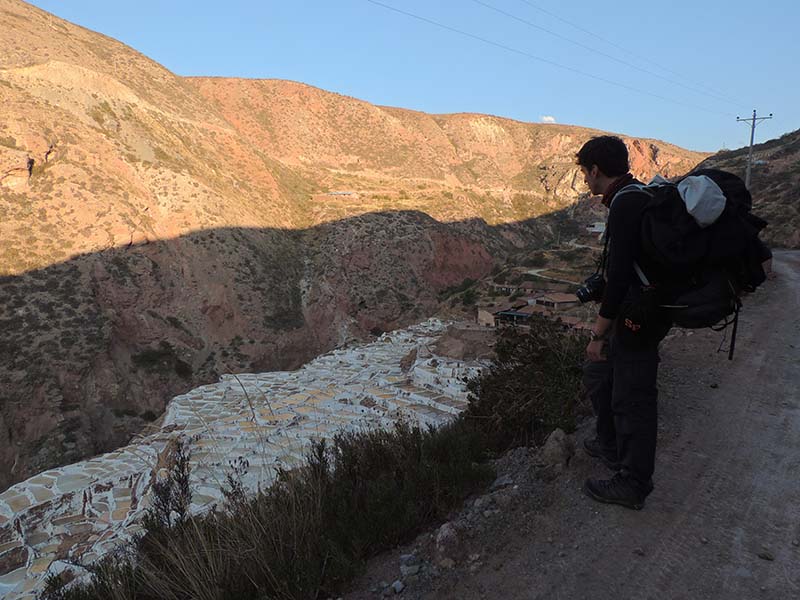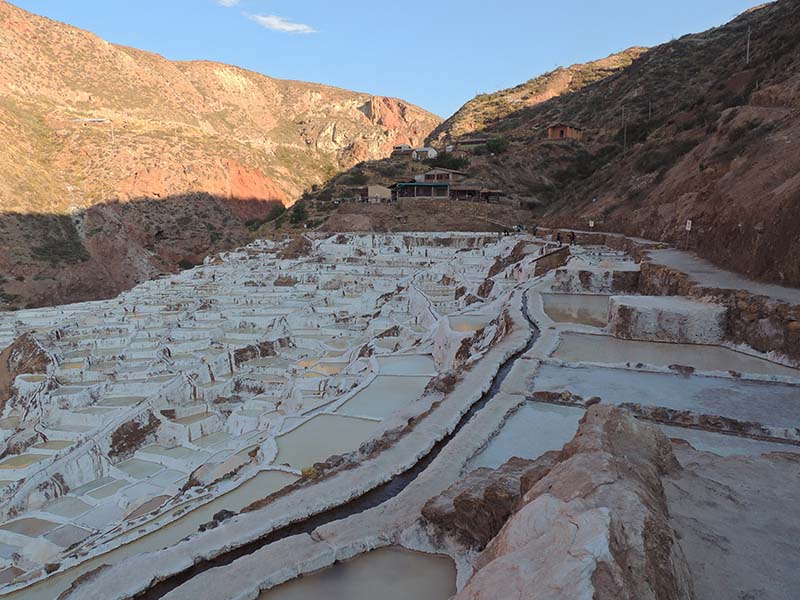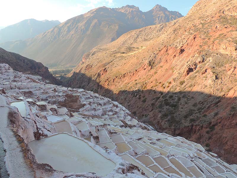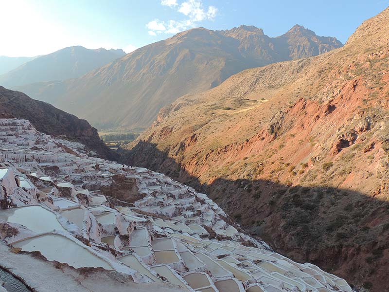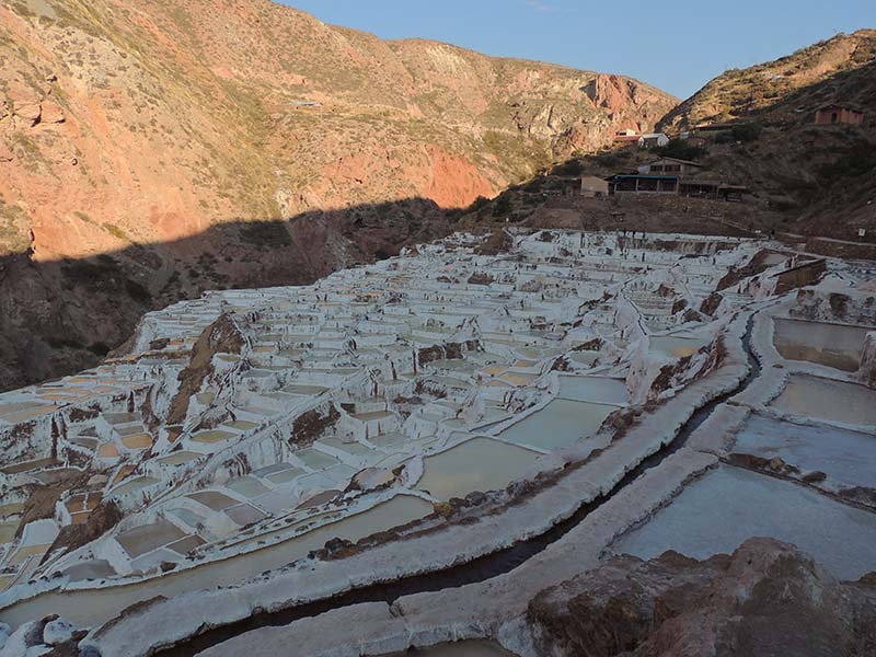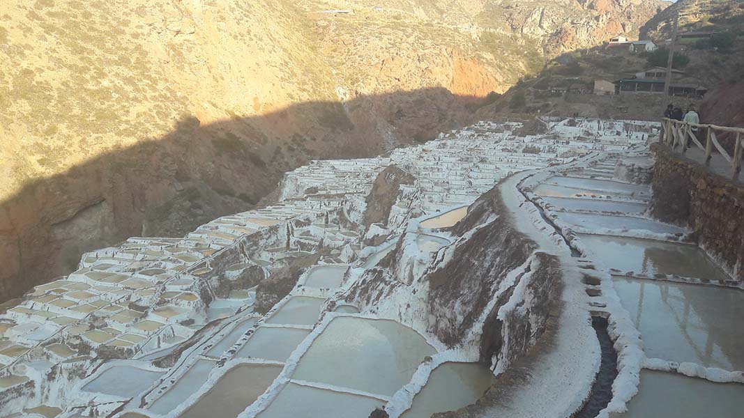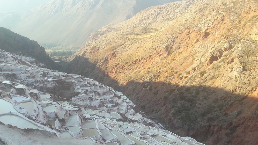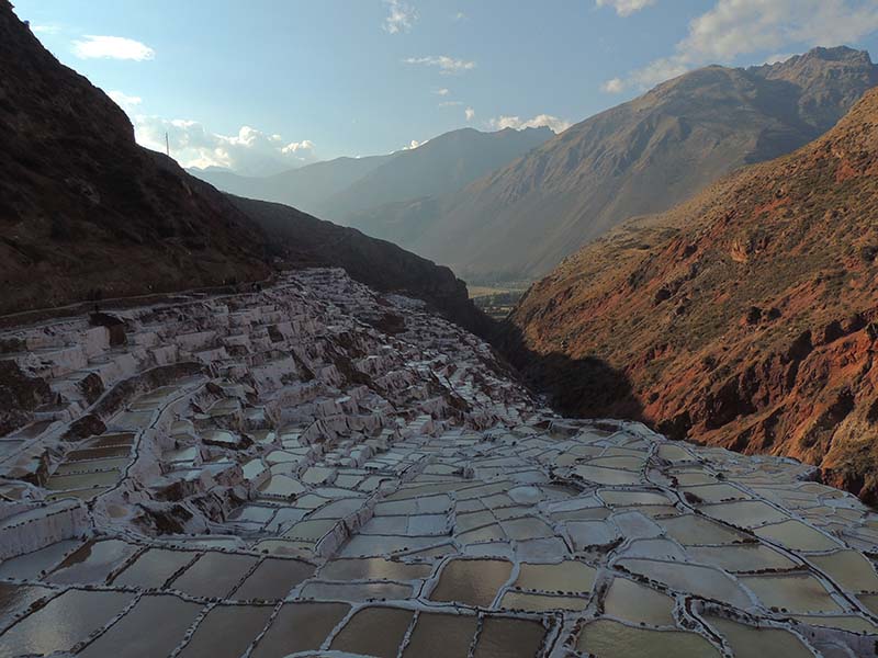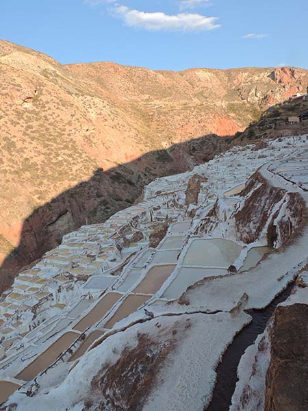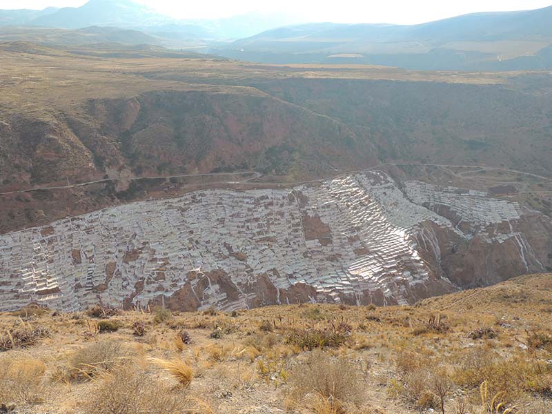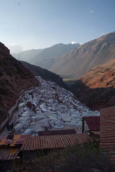 Nous arrivons dans le marché d’objets d’artisanats locaux. Après quelques emplettes, nous allons manger au Blue lama, un petit restaurant snack très sympa. Après être passé par un cyber café pour réimprimer les billets du Machu Picchu (toute une histoire), nous reprenons un collectivo pour Urubumba, un peu plus loin dans la vallée. Arrivés là, le village n’est malheureusement pas très beau comparé au reste de la vallée. Nous cherchons un moyen d’aller à Maras, tout y passe, taxi sans chauffeur, gare de collectivos introuvable... Nous finissons par tomber sur une moto tricycle taxi qui nous conduit vaillamment jusqu’à Maras plus haut dans la montagne et nous amène même jusqu’aux Salines. On ne savait pas trop si l’engin à trois roues en serait capable mais si, et sa conductrice a bien géré la piste très impressionnante. Nous voilà à un endroit assez méconnu mais très beau du Pérou, au sein d’une gorge baignée de soleil le matin et en début d’après-midi, se dressent les Salineras de Maras. Le sel provient d’une source d’eau tiède... salée, chauffée par le volcanisme. Cette eau est ensuite acheminée via des canaux dans des petits bassins pour ensuite s’évaporer et laisser le sel. On dirait de la neige. L’endroit est assez magique. Nous descendons ensuite à pied pour 45 min et après avoir traversé un pont pas forcément des plus rassurants, nous arrivons à Tarabamba.