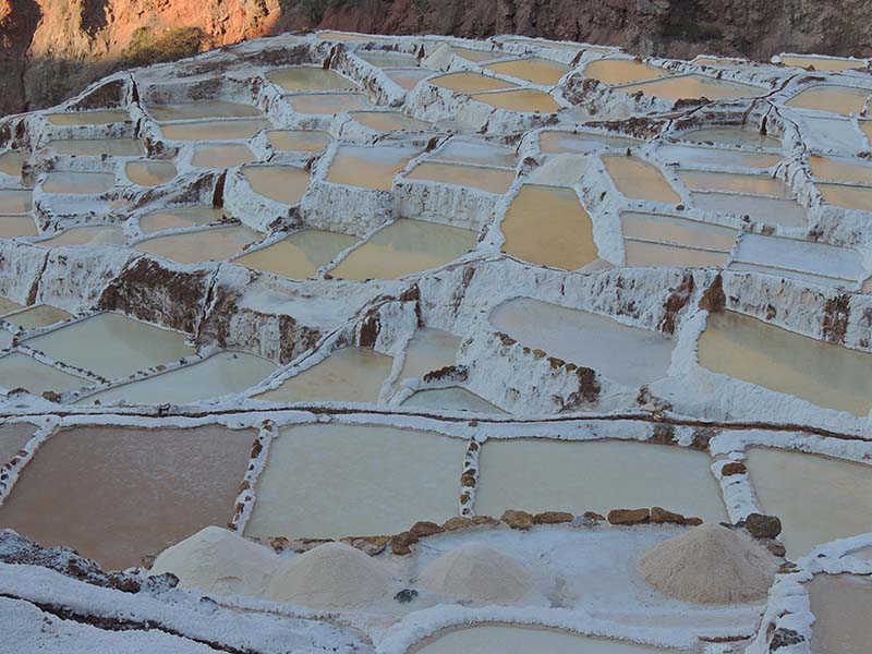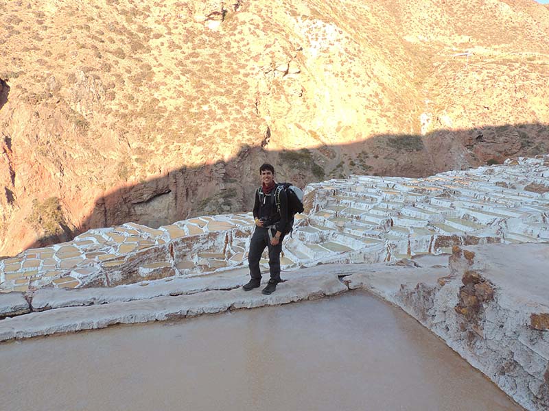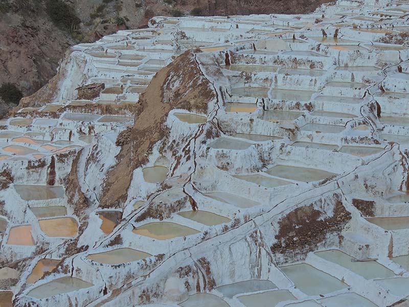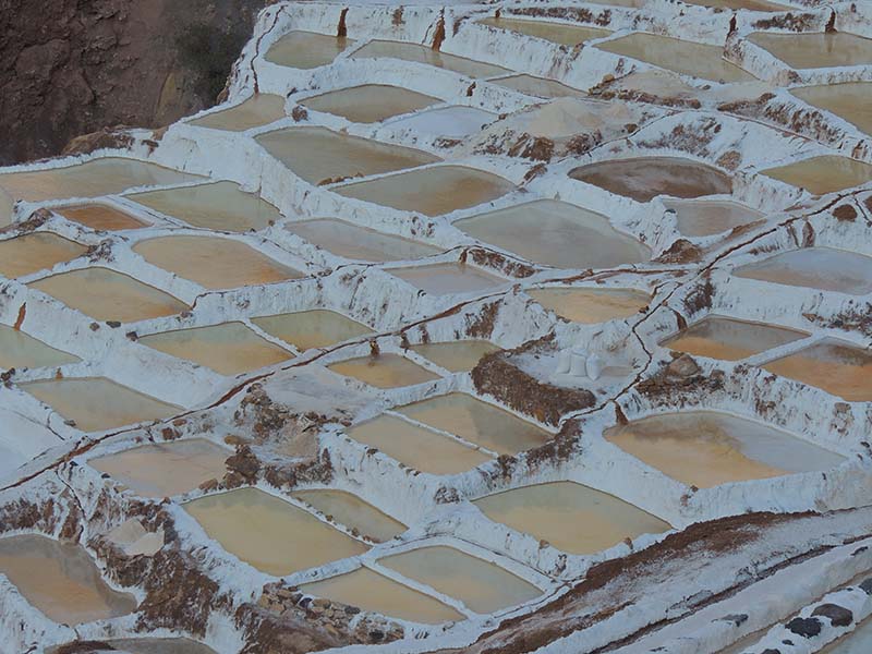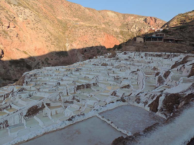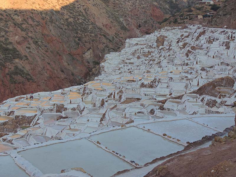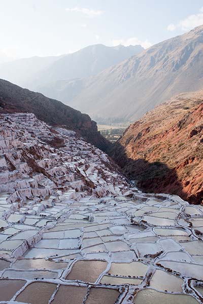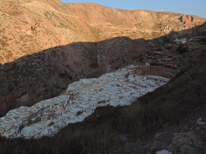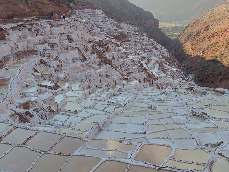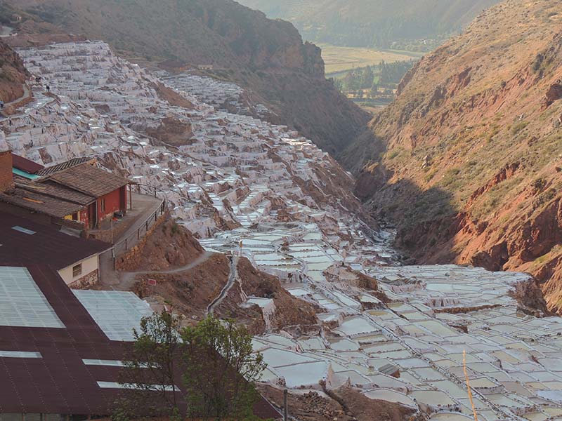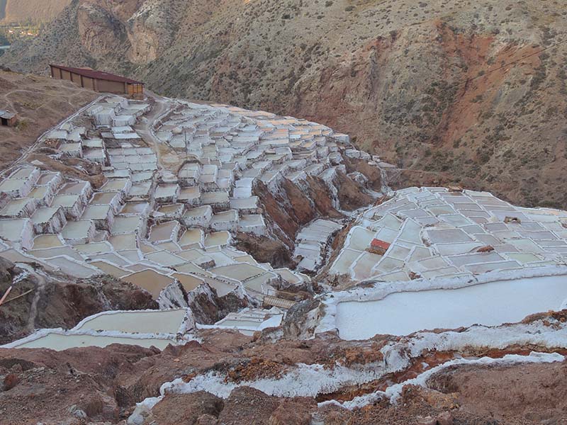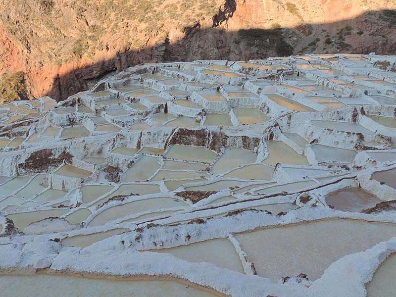 Nous arrivons dans le marché d’objets d’artisanats locaux. Après quelques emplettes, nous allons manger au Blue lama, un petit restaurant snack très sympa. Après être passé par un cyber café pour réimprimer les billets du Machu Picchu (toute une histoire), nous reprenons un collectivo pour Urubumba, un peu plus loin dans la vallée. Arrivés là, le village n’est malheureusement pas très beau comparé au reste de la vallée. Nous cherchons un moyen d’aller à Maras, tout y passe, taxi sans chauffeur, gare de collectivos introuvable... Nous finissons par tomber sur une moto tricycle taxi qui nous conduit vaillamment jusqu’à Maras plus haut dans la montagne et nous amène même jusqu’aux Salines. On ne savait pas trop si l’engin à trois roues en serait capable mais si, et sa conductrice a bien géré la piste très impressionnante. Nous voilà à un endroit assez méconnu mais très beau du Pérou, au sein d’une gorge baignée de soleil le matin et en début d’après-midi, se dressent les Salineras de Maras. Le sel provient d’une source d’eau tiède... salée, chauffée par le volcanisme. Cette eau est ensuite acheminée via des canaux dans des petits bassins pour ensuite s’évaporer et laisser le sel. On dirait de la neige. L’endroit est assez magique. Nous descendons ensuite à pied pour 45 min et après avoir traversé un pont pas forcément des plus rassurants, nous arrivons à Tarabamba.