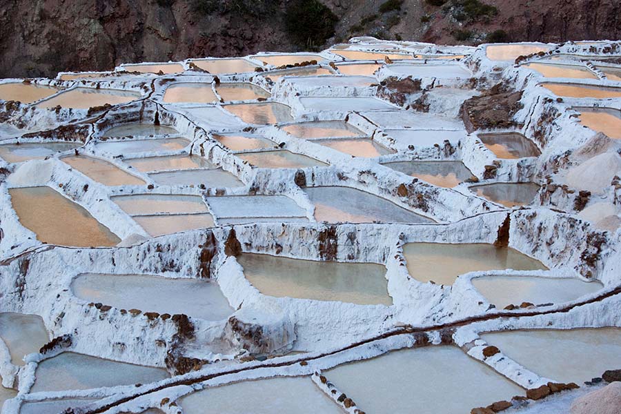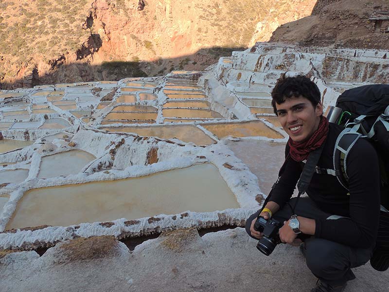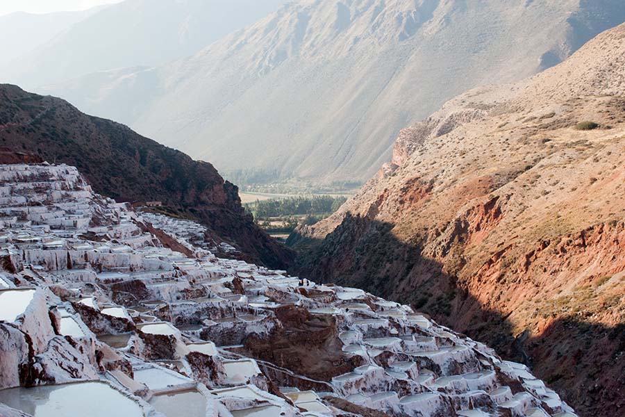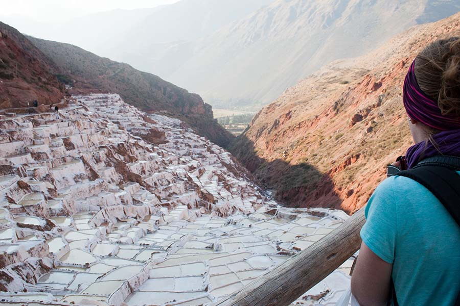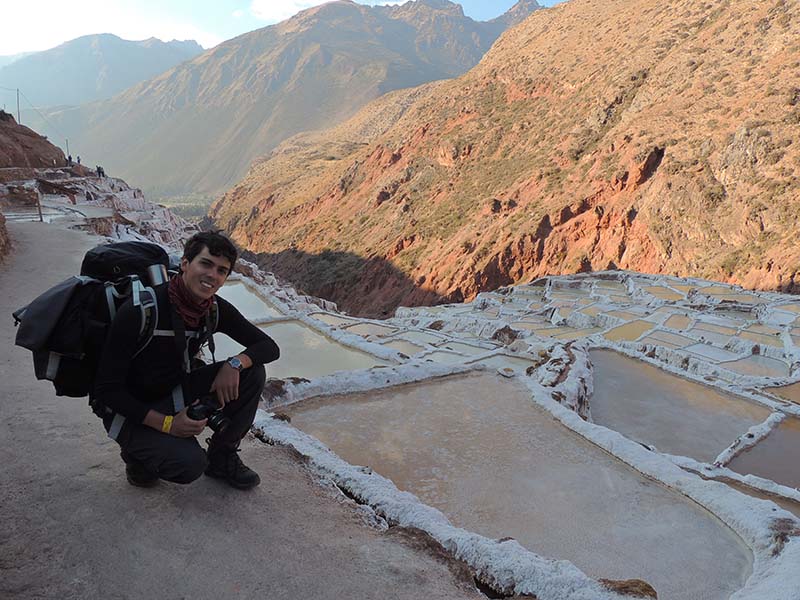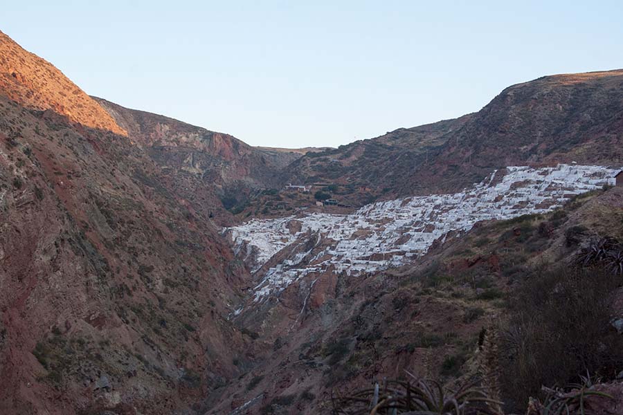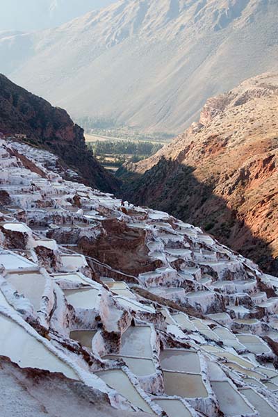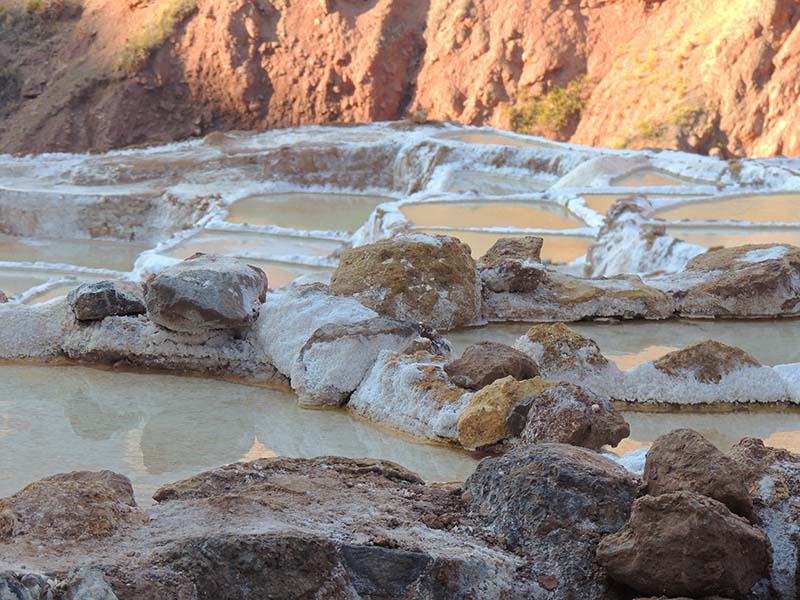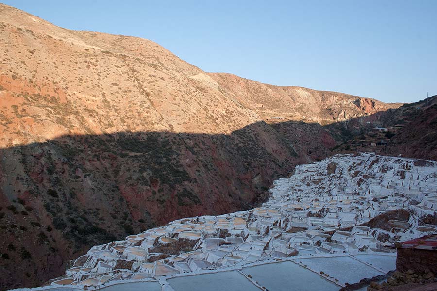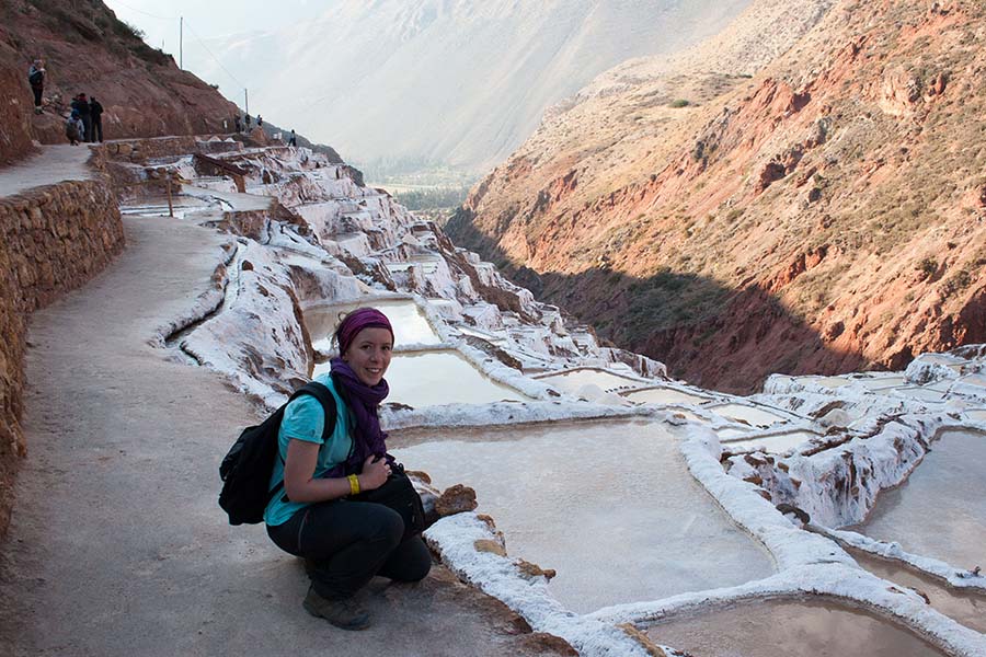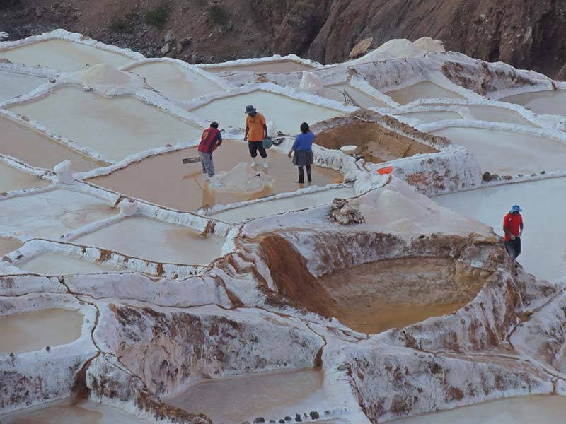Nous arrivons dans le marché d’objets d’artisanats locaux. Après quelques emplettes, nous allons manger au Blue lama, un petit restaurant snack très sympa. Après être passé par un cyber café pour réimprimer les billets du Machu Picchu (toute une histoire), nous reprenons un collectivo pour Urubumba, un peu plus loin dans la vallée. Arrivés là, le village n’est malheureusement pas très beau comparé au reste de la vallée. Nous cherchons un moyen d’aller à Maras, tout y passe, taxi sans chauffeur, gare de collectivos introuvable... Nous finissons par tomber sur une moto tricycle taxi qui nous conduit vaillamment jusqu’à Maras plus haut dans la montagne et nous amène même jusqu’aux Salines. On ne savait pas trop si l’engin à trois roues en serait capable mais si, et sa conductrice a bien géré la piste très impressionnante. Nous voilà à un endroit assez méconnu mais très beau du Pérou, au sein d’une gorge baignée de soleil le matin et en début d’après-midi, se dressent les Salineras de Maras. Le sel provient d’une source d’eau tiède... salée, chauffée par le volcanisme. Cette eau est ensuite acheminée via des canaux dans des petits bassins pour ensuite s’évaporer et laisser le sel. On dirait de la neige. L’endroit est assez magique. Nous descendons ensuite à pied pour 45 min et après avoir traversé un pont pas forcément des plus rassurants, nous arrivons à Tarabamba.