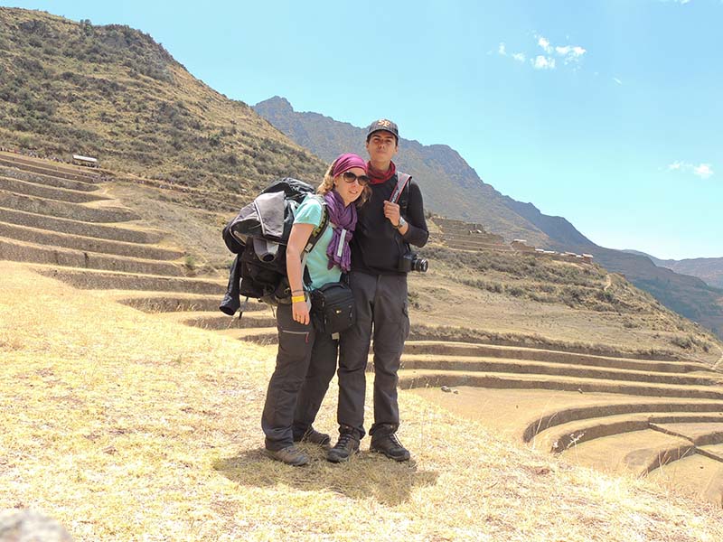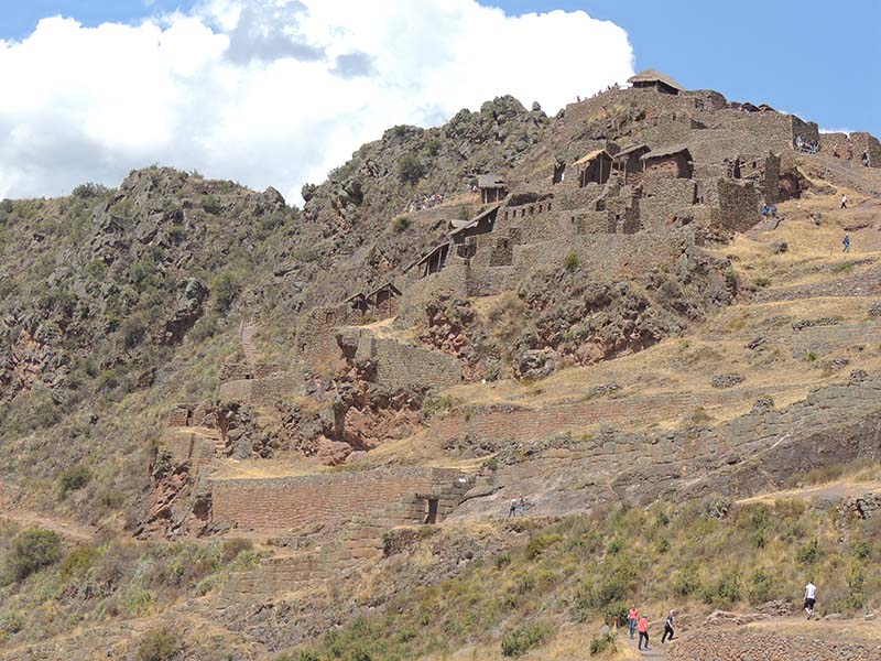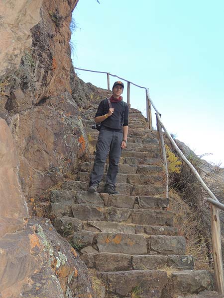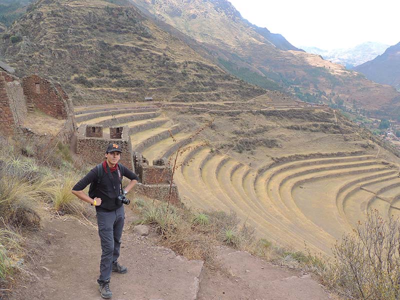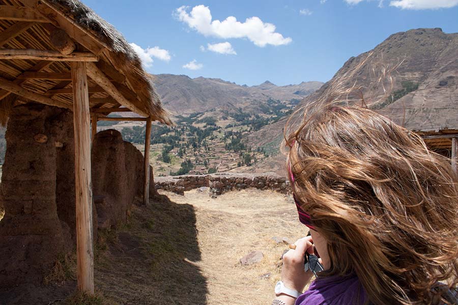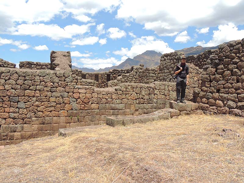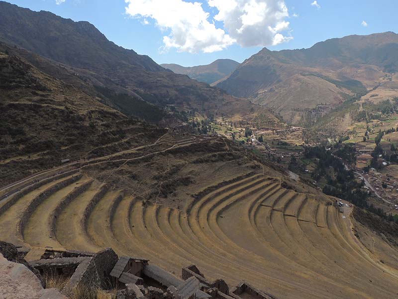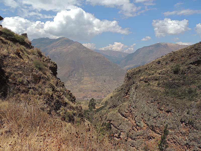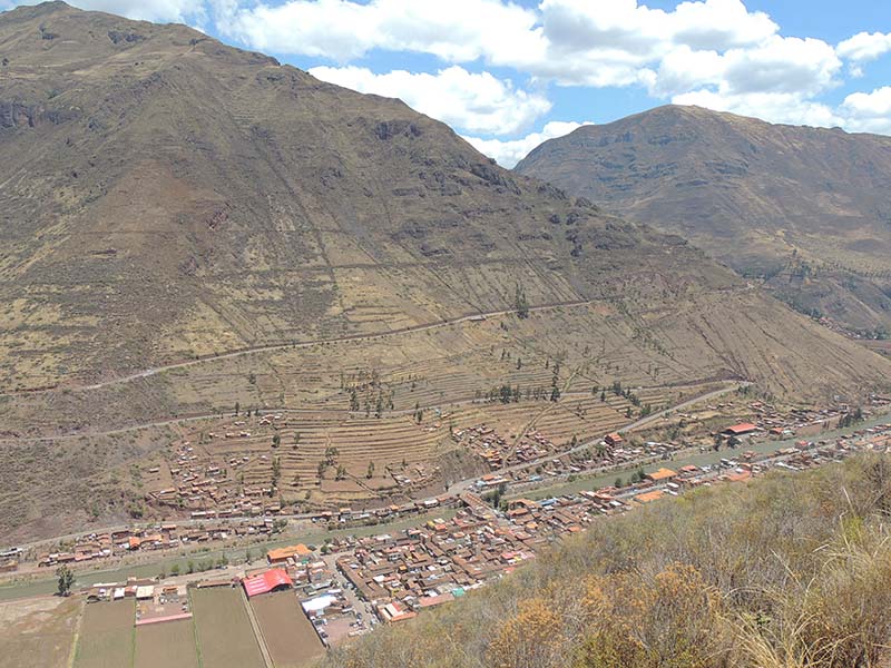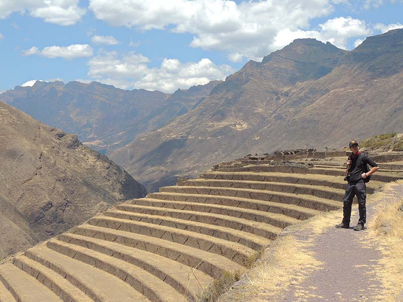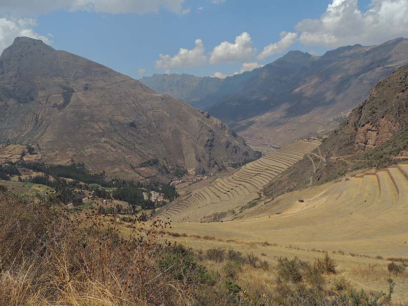Romain : Aujourd’hui nous partons pour la vallée sacrée ! Après un petit-déj sommaire et avoir laissé une partie de nos affaires à l’hôtel, nous partons pour aller prendre un collectivo (un bus populaire). C’est bien il fait beau et chaud, ça faisait longtemps surtout que la douche du matin a été plutôt glaciale. Nous arrivons au point marqué sur le plan pour prendre le collectivo... et rien ! Nous demandons aux policiers et à des conducteurs de bus dans le coin. Nous finissons par prendre un taxi qui nous amène au terminal qui était en fait très loin. Nous sommes pile à l’heure. Nous voilà parti pour Pisac, notre première destination dans la vallée sacrée. Arrivés à Pisac, nous prenons un taxi pour aller aux ruines Inca. Elles sont perchées en haut d’une montagne surplombant des champs en terrasse. Il y a plusieurs villages, c’est assez impressionnant surtout que la montagne est assez à pic.