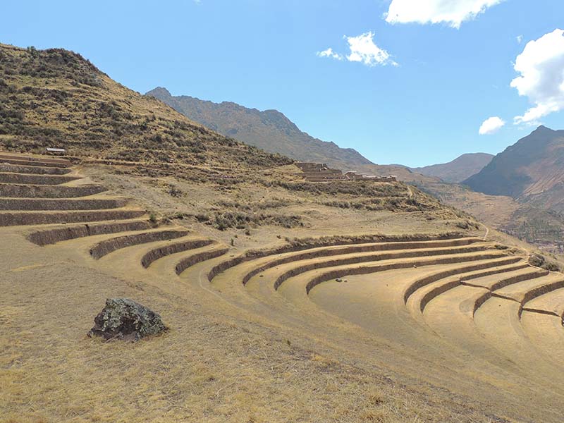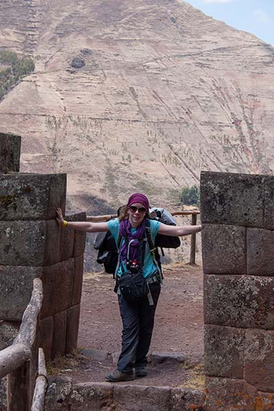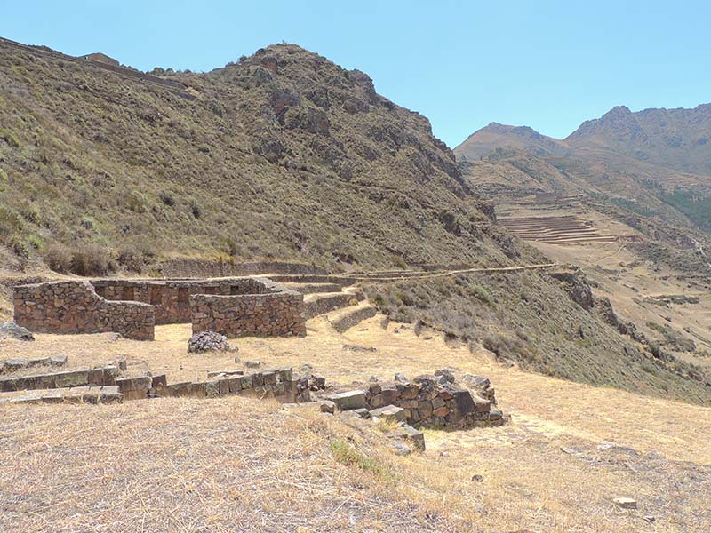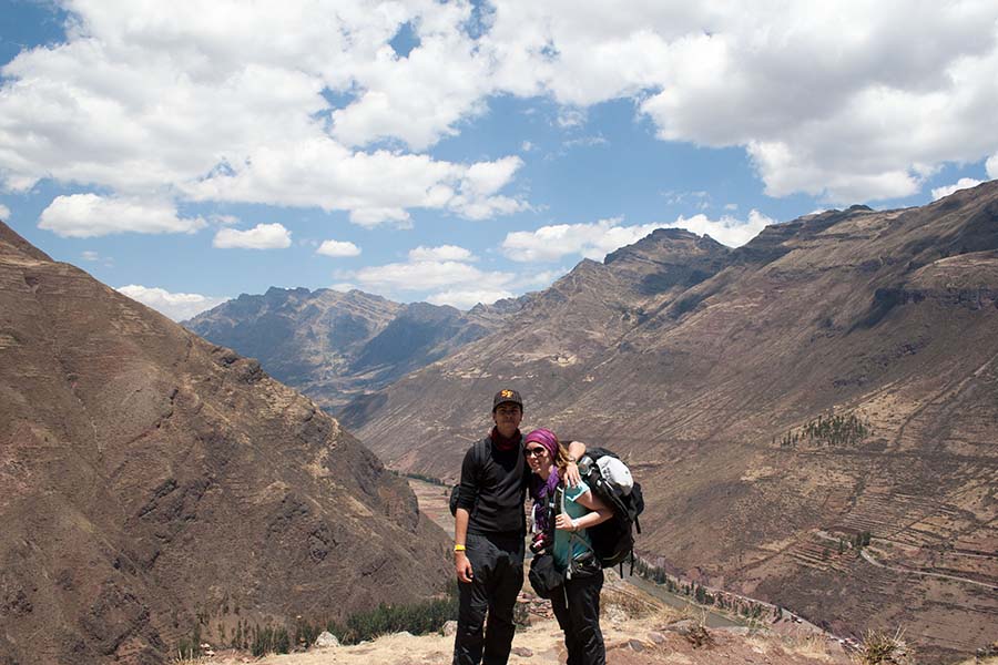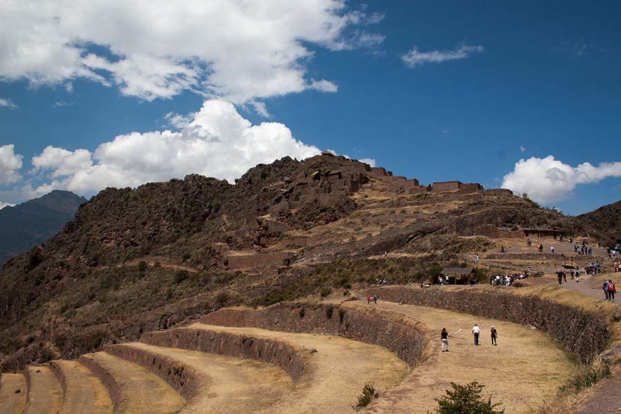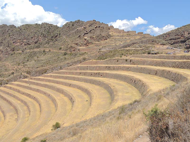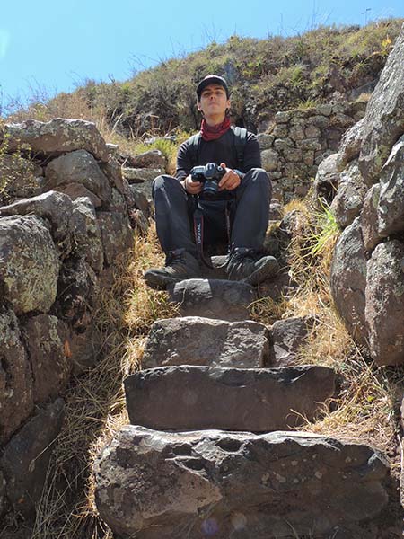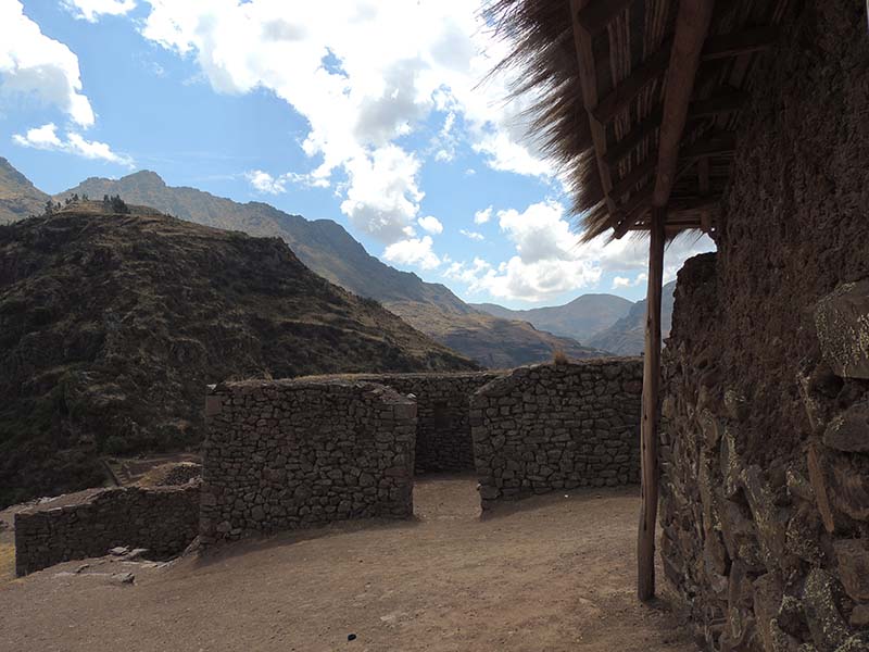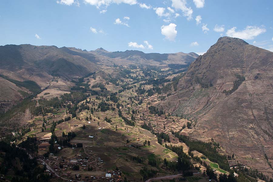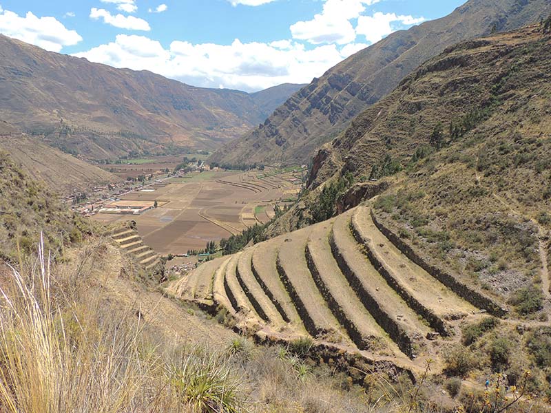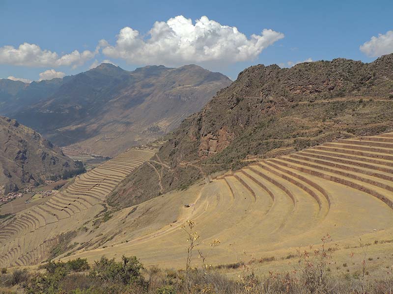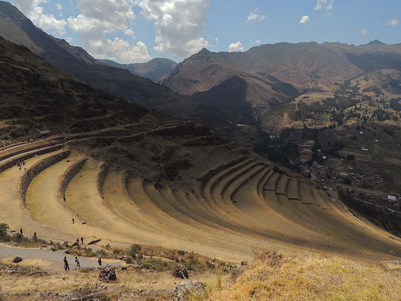 Romain : Aujourd’hui nous partons pour la vallée sacrée ! Après un petit-déj sommaire et avoir laissé une partie de nos affaires à l’hôtel, nous partons pour aller prendre un collectivo (un bus populaire). C’est bien il fait beau et chaud, ça faisait longtemps surtout que la douche du matin a été plutôt glaciale. Nous arrivons au point marqué sur le plan pour prendre le collectivo... et rien ! Nous demandons aux policiers et à des conducteurs de bus dans le coin. Nous finissons par prendre un taxi qui nous amène au terminal qui était en fait très loin. Nous sommes pile à l’heure. Nous voilà parti pour Pisac, notre première destination dans la vallée sacrée. Arrivés à Pisac, nous prenons un taxi pour aller aux ruines Inca. Elles sont perchées en haut d’une montagne surplombant des champs en terrasse. Il y a plusieurs villages, c’est assez impressionnant surtout que la montagne est assez à pic.