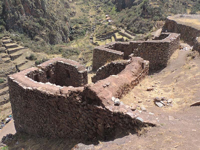 En route, je réalise que je n’ai pas pris les billets du Machu Picchu, restés dans le sac laissé chez Mamma Cusco !!! AAAHhhhhh ! Heureusement nous nous rassurons en repensant à nos scans envoyés sur nos boîtes mail. Il ne restera plus qu’à trouver une connexion + une imprimante sinon on optera pour un A/R à Cusco. Pour l’heure, nous essayons de profiter au maximum de ce site grandiose des ruines de Pisac. Il y a des choses à voir de partout ! Après l’avoir bien parcouru, nous prenons le chemin qui nous ramène au village de Pisac. Très bonne idée car nous voyons encore plein d’autres ruines. 12h30-13h nous voilà en bas ! Nous cherchons un resto doté d’une connexion wifi, Blue Lama nous convient ! De bons sandwichs engloutis et des pdf de billets téléchargés, nous voilà maintenant en quête d’une imprimante. Le restaurateur nous indique un endroit, nous y allons de ce pas. Une gentille dame avec sa petite fille (10 mois) laisse Romain gérer l’impression.
