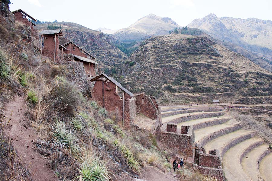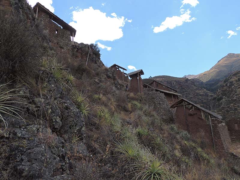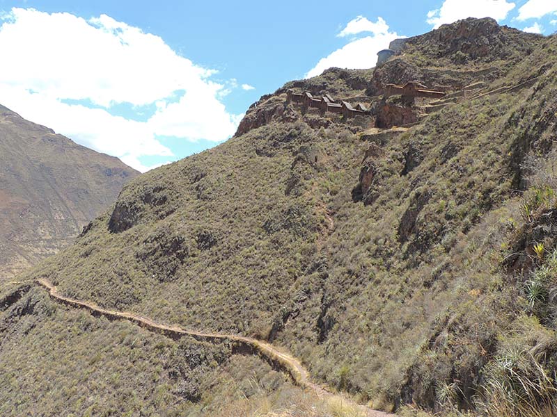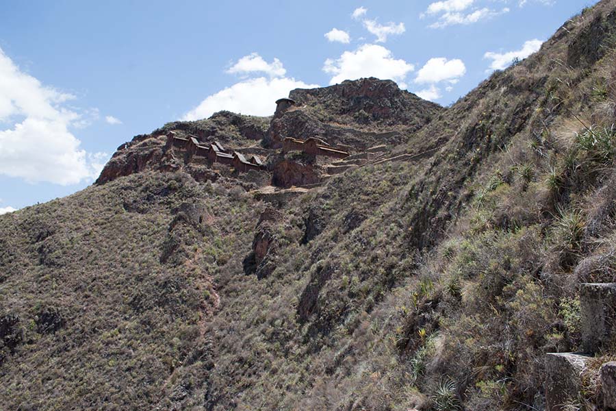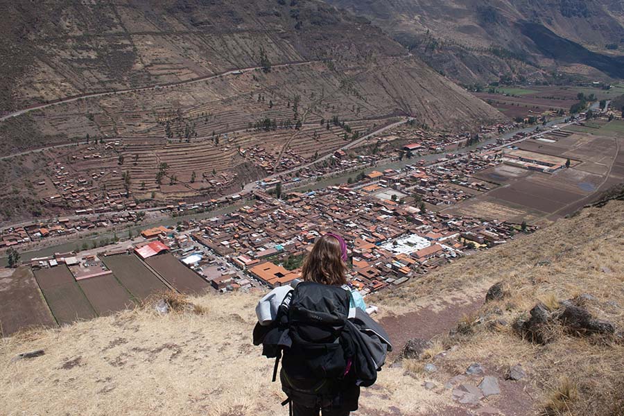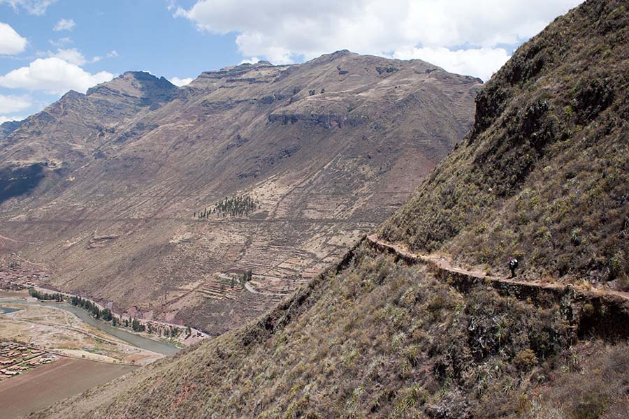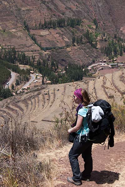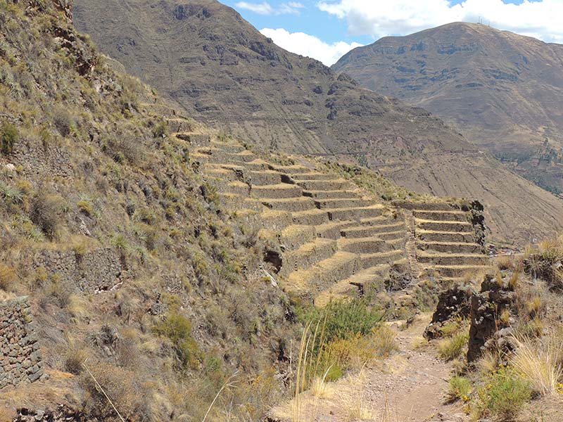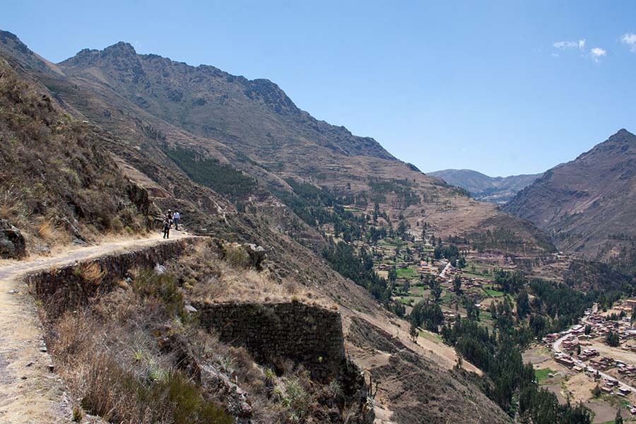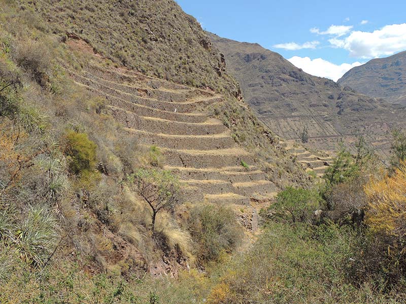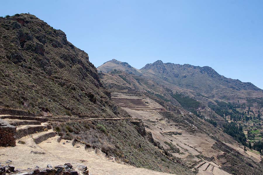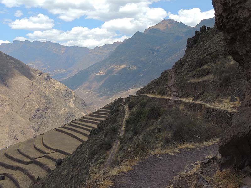 Nous faisons le tour des ruines principales mais il y a beaucoup de monde. Nous décidons de prendre un sentier pour rejoindre Pisac. Là par contre il y a personne. On traverse d’autres villages, des champs en terrasse, ils sont là pour nous tout seul, c’est très sympa. Le sentier lui aussi est très impressionnant avec une pente assez effrayante. Notre descente dure environ 1h45.