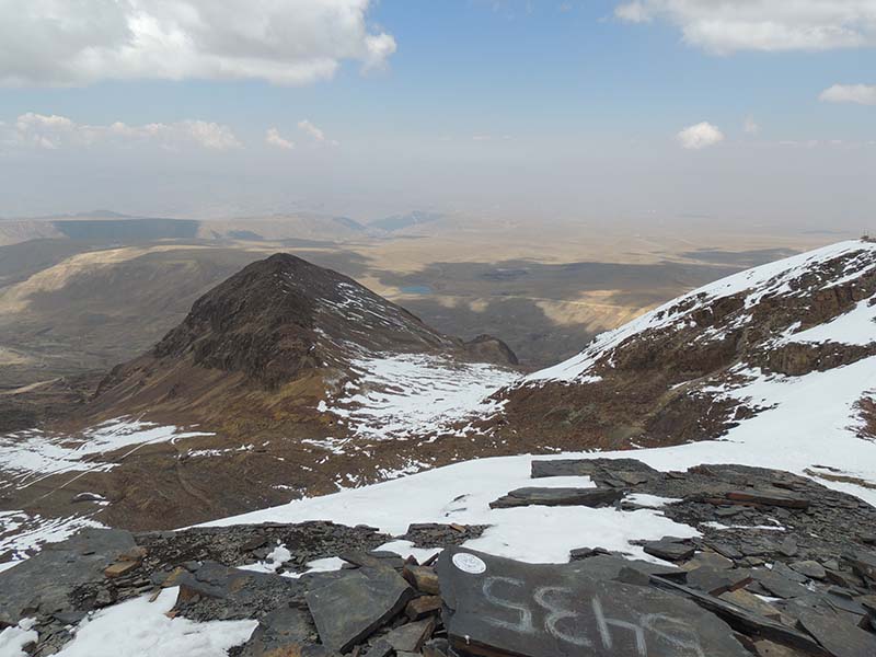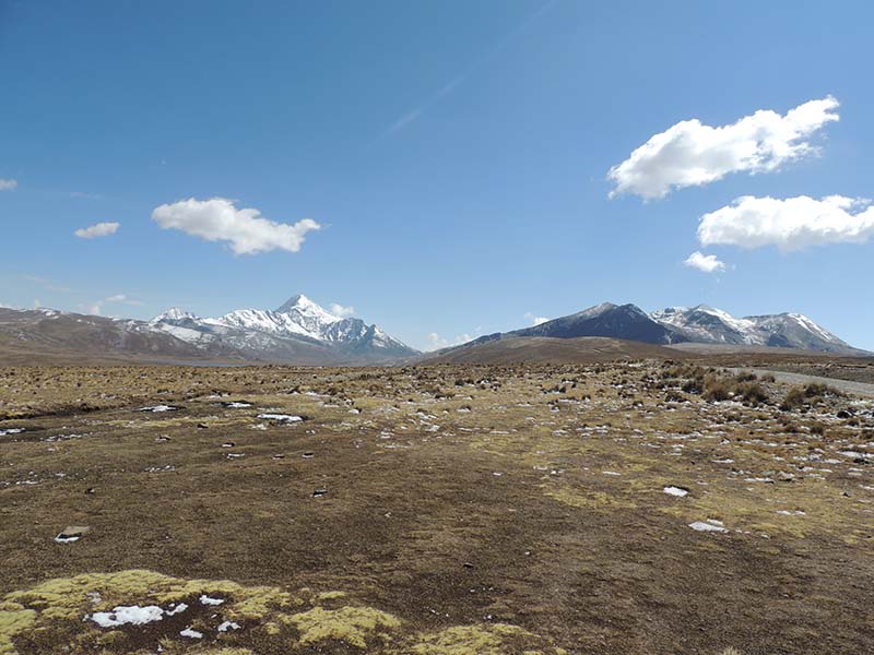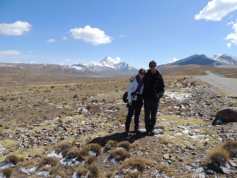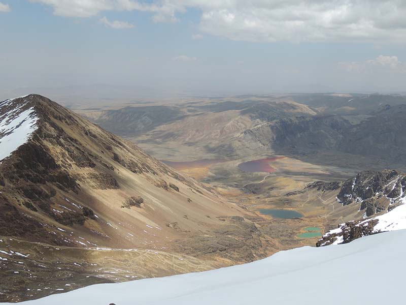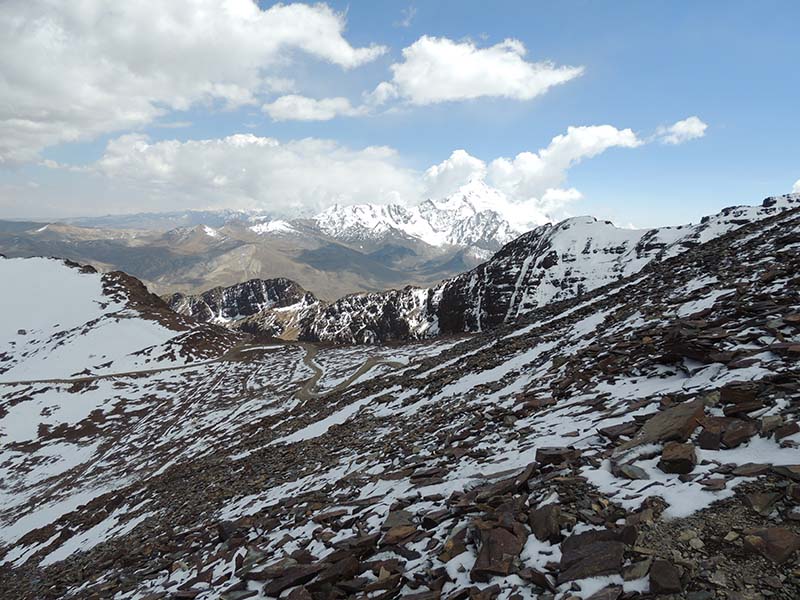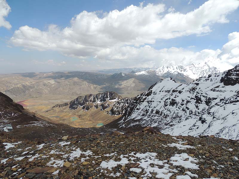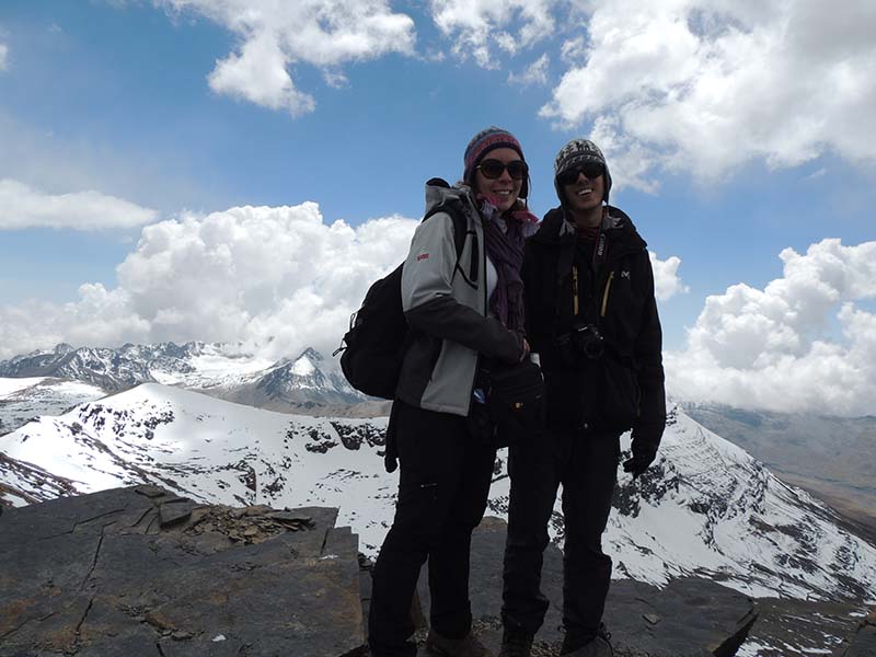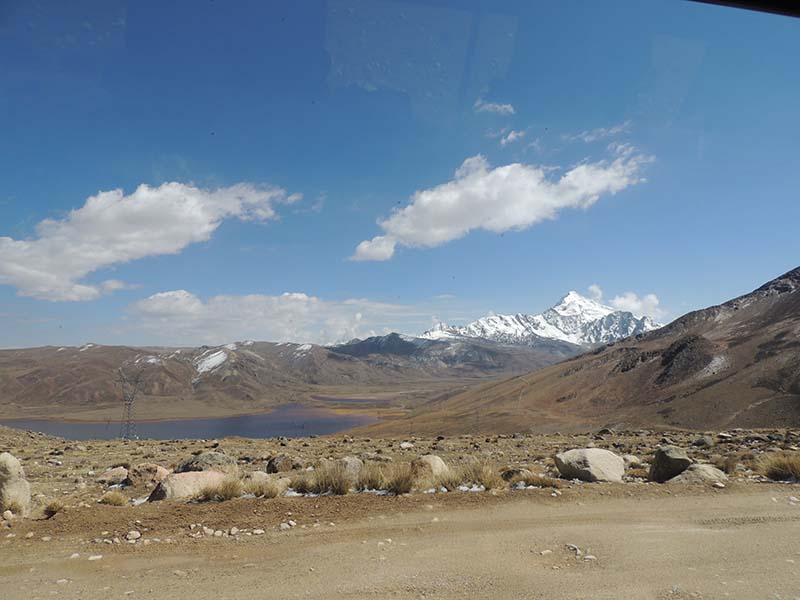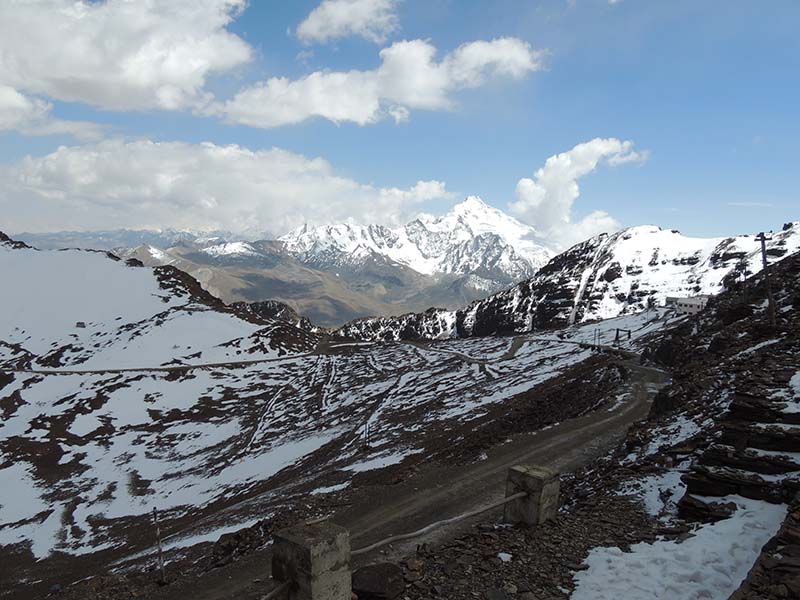 Cam : réveil pas trop tardif pour prendre le temps de petit déjeuner avant de partir pour le Mont Chacaltaya à 8h-8h20. Le petit-déj est copieux, le chauffeur du van pour l’excursion est à l’heure (pour un bolivien) et hop on est parti pour l’aventure. On parcourt tout La Paz pour récupérer tous les participants. On fait la connaissance de 2 Suisses fraîchement arrivés en Bolivie. Le mec a un peu le mal de l’altitude… qu’est-ce que ça va être à 5435m… en tout cas, ils sont bien sympa. Après environ 2h de route dont l’ascension spectaculaire de notre van/camionnette sur une piste rocailleuse, très pentue et parfois humide, nous arrivons à l’ancienne station de ski du Chacaltaya. La guide nous conseille sur les chemins à emprunter selon notre état avec l’altitude. Un des participants nous dit d’ailleurs, qu’en haut, on sera à 50% d’oxygène pile poil ! Notre ascension se passe bien, c’est magnifique. On est sur le toit du monde. Notre chemin est enneigé, parfois un peu verglacé, on se prend pour des alpinistes en herbe.