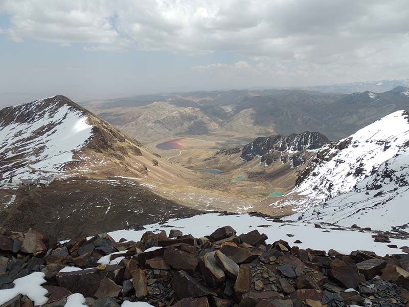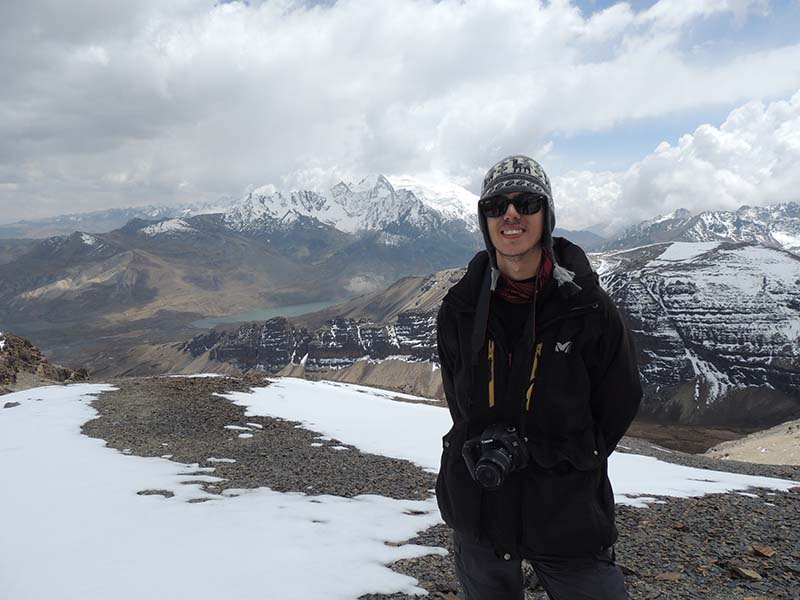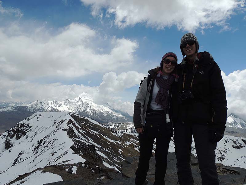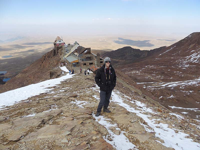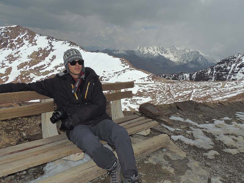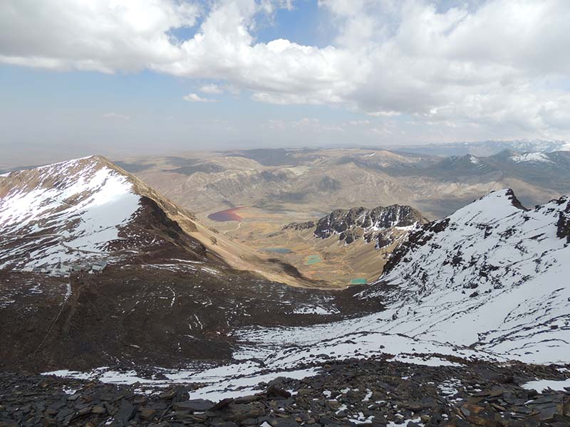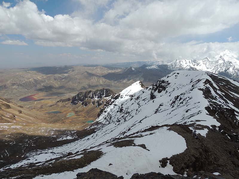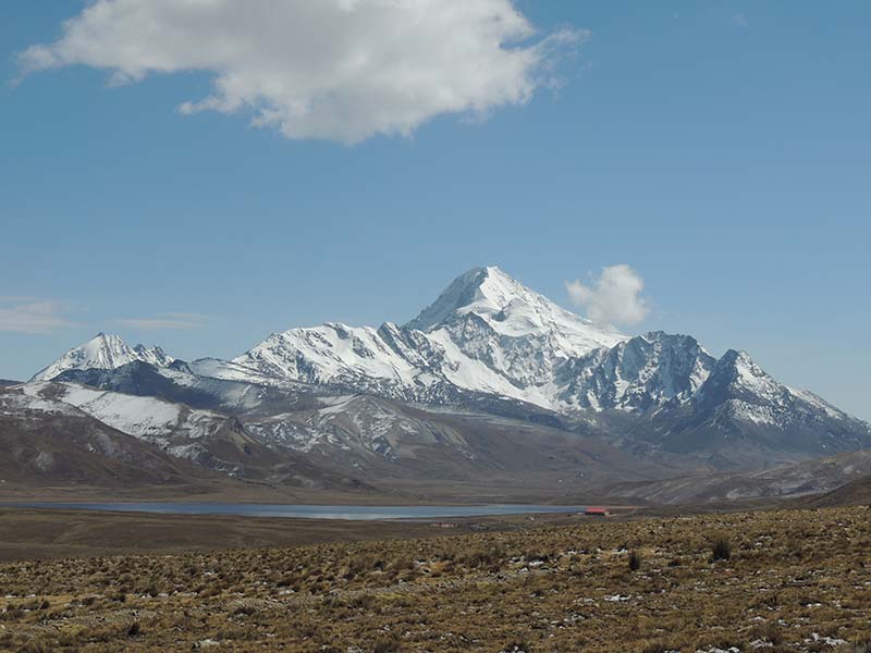 Cam : réveil pas trop tardif pour prendre le temps de petit déjeuner avant de partir pour le Mont Chacaltaya à 8h-8h20. Le petit-déj est copieux, le chauffeur du van pour l’excursion est à l’heure (pour un bolivien) et hop on est parti pour l’aventure. On parcourt tout La Paz pour récupérer tous les participants. On fait la connaissance de 2 Suisses fraîchement arrivés en Bolivie. Le mec a un peu le mal de l’altitude… qu’est-ce que ça va être à 5435m… en tout cas, ils sont bien sympa. Après environ 2h de route dont l’ascension spectaculaire de notre van/camionnette sur une piste rocailleuse, très pentue et parfois humide, nous arrivons à l’ancienne station de ski du Chacaltaya. La guide nous conseille sur les chemins à emprunter selon notre état avec l’altitude. Un des participants nous dit d’ailleurs, qu’en haut, on sera à 50% d’oxygène pile poil ! Notre ascension se passe bien, c’est magnifique. On est sur le toit du monde. Notre chemin est enneigé, parfois un peu verglacé, on se prend pour des alpinistes en herbe.