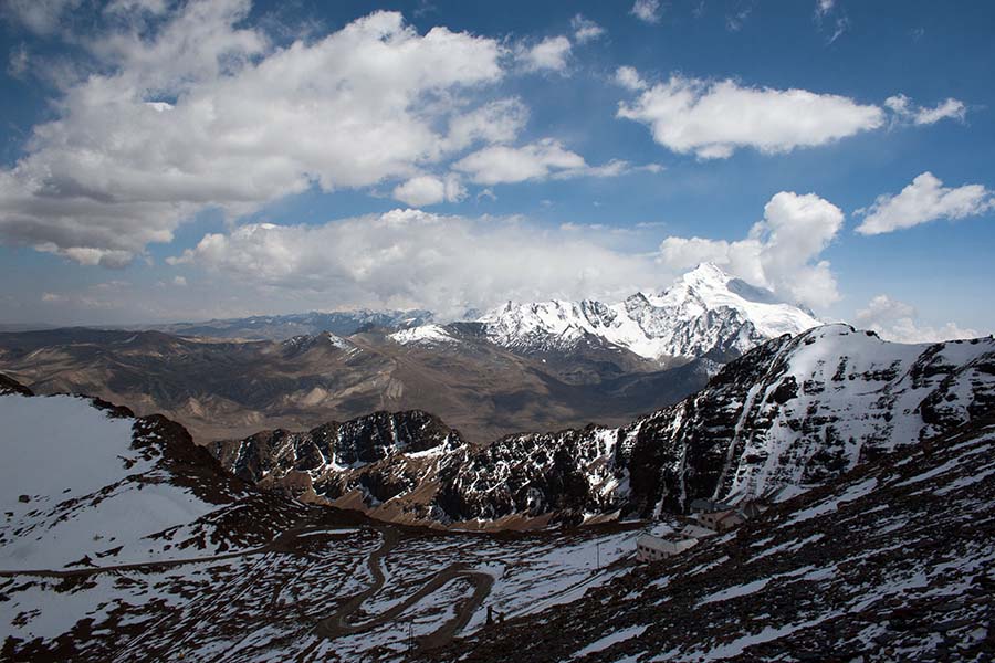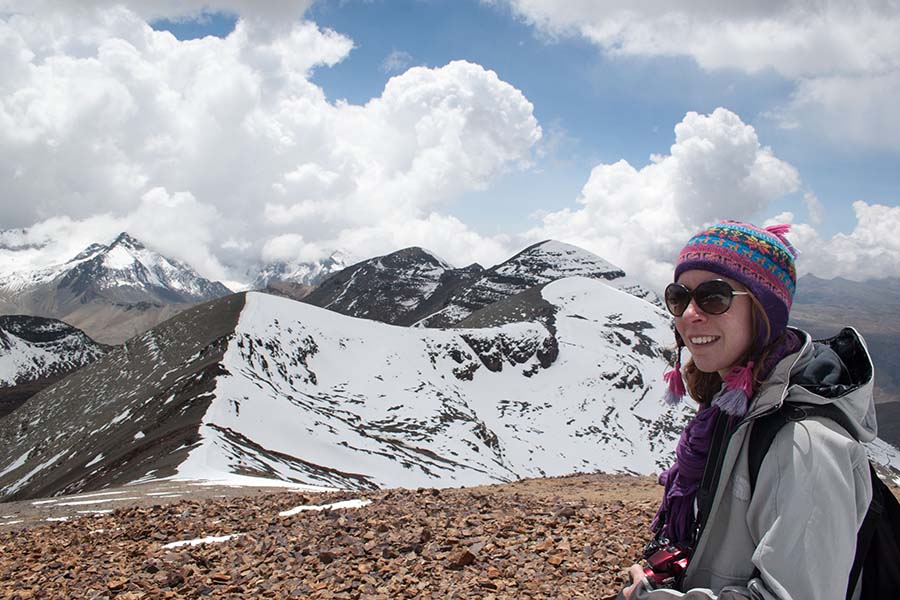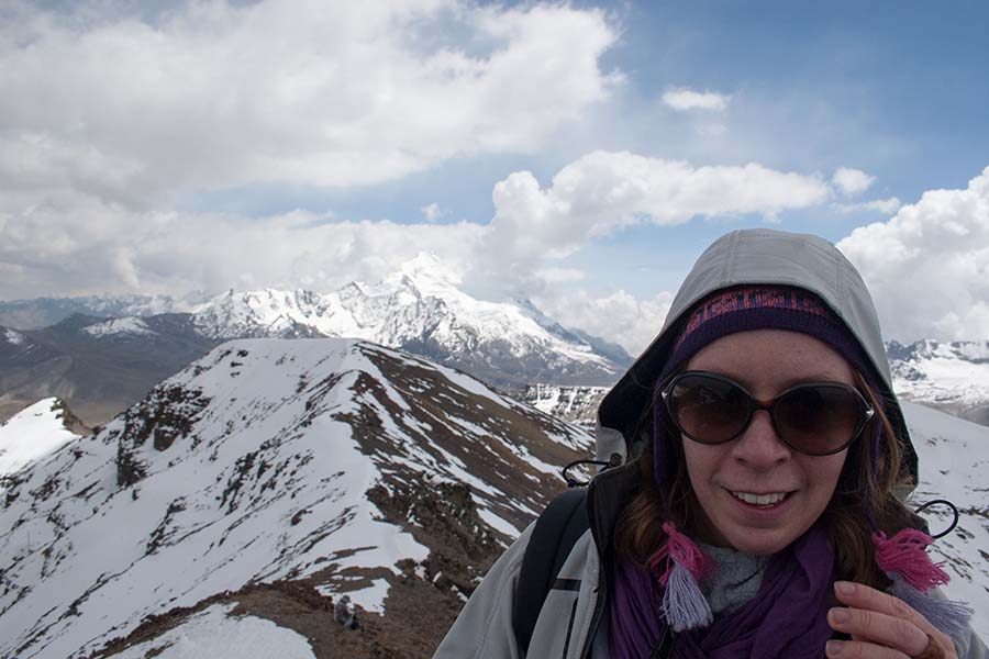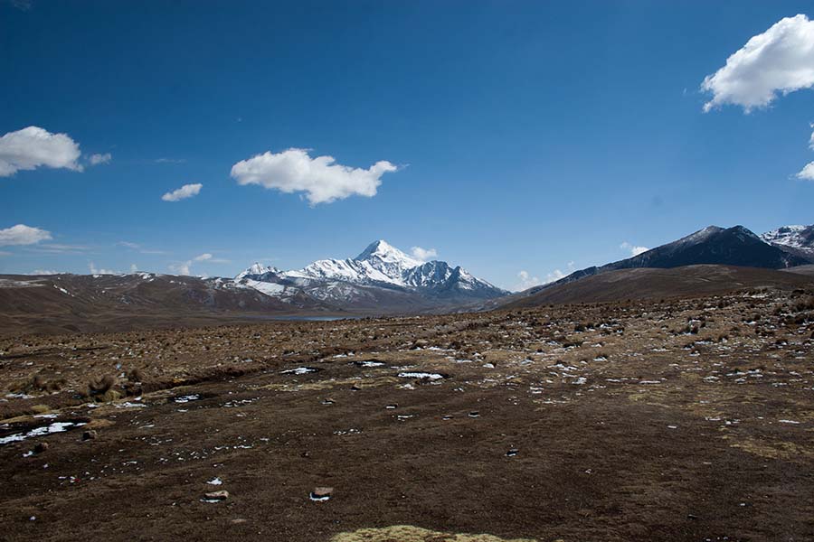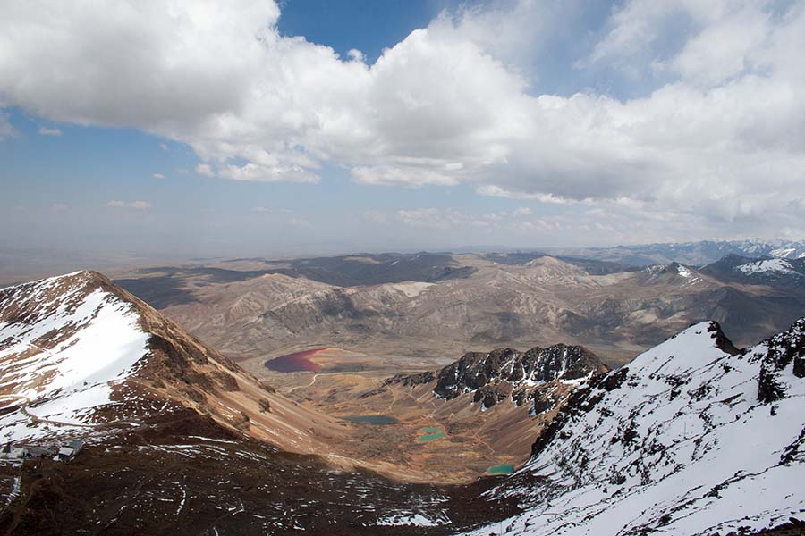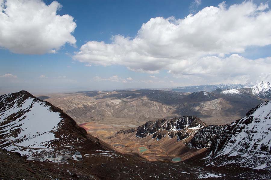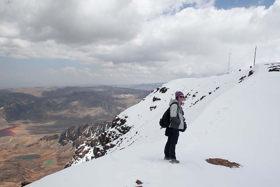 Romain : Après un petit-déj avec du quinoa soufflé, nous prenons le bus de l’agence pour partir vers le Chacaltaya. Après avoir ramassé tous les participants, nous commençons l’ascension vers les quartiers plus pauvres de La Paz. Pour ce petit bus 4x4 ^, c’est un vrai exploit vu comment il est chargé ! Après être sorti de la ville dont les « routes » ne sont déjà pas un exemple, nous entamons une piste particulièrement défoncée. Nous finissons par voir le Huayna potosi, magnifique, derrière un lac aux couleurs étranges, dues aux algues, bactéries et aux cristaux présents tels que l’arsenic. Il donne des couleurs changeant en fonction de la luminosité, la température… Nous continuons la piste qui se fait de moins en moins large et de plus en plus défoncée. Après une montée très longue, nous arrivons aux vestiges de la station de ski du Chacaltaya, en son temps la plus haute du monde avec 5300m ! Mais le sommet n’est pas encore là, on doit encore faire environ 150m de dénivelé à pied. Arrivés à 5435m, le voilà le sommet ! Quelle vue, c’est magique ! L’impression d’être sur le toit du monde. En face, le Huayna potosi encore plus haut et dans le fond, le lac Titicaca !