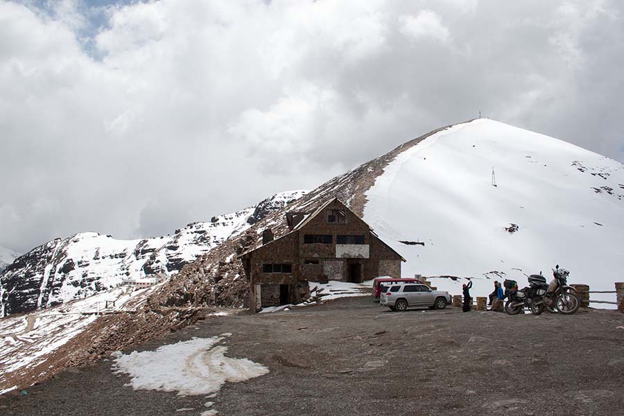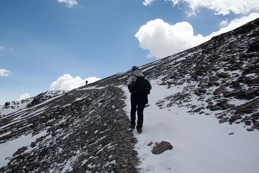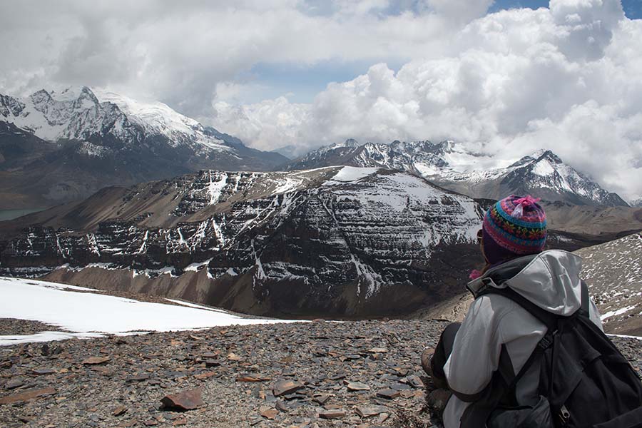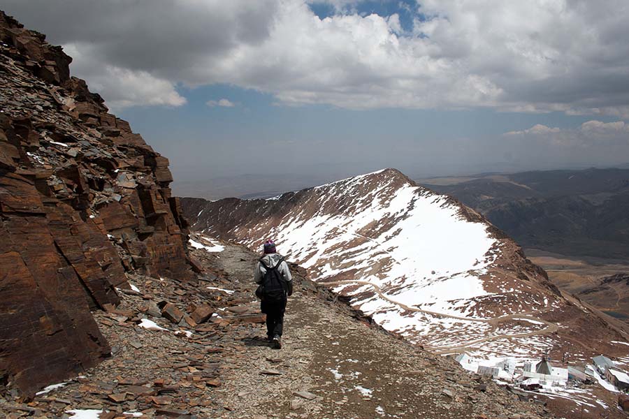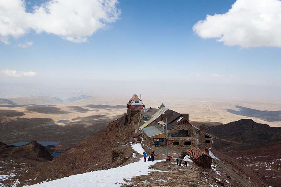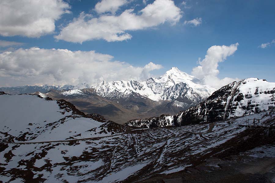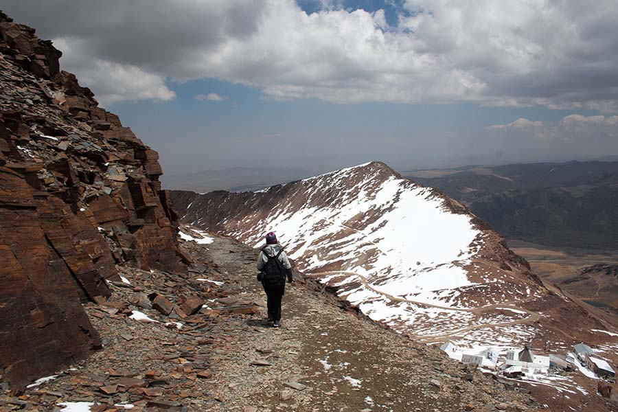 Romain : Après un petit-déj avec du quinoa soufflé, nous prenons le bus de l’agence pour partir vers le Chacaltaya. Après avoir ramassé tous les participants, nous commençons l’ascension vers les quartiers plus pauvres de La Paz. Pour ce petit bus 4x4 ^, c’est un vrai exploit vu comment il est chargé ! Après être sorti de la ville dont les « routes » ne sont déjà pas un exemple, nous entamons une piste particulièrement défoncée. Nous finissons par voir le Huayna potosi, magnifique, derrière un lac aux couleurs étranges, dues aux algues, bactéries et aux cristaux présents tels que l’arsenic. Il donne des couleurs changeant en fonction de la luminosité, la température… Nous continuons la piste qui se fait de moins en moins large et de plus en plus défoncée. Après une montée très longue, nous arrivons aux vestiges de la station de ski du Chacaltaya, en son temps la plus haute du monde avec 5300m ! Mais le sommet n’est pas encore là, on doit encore faire environ 150m de dénivelé à pied. Arrivés à 5435m, le voilà le sommet ! Quelle vue, c’est magique ! L’impression d’être sur le toit du monde. En face, le Huayna potosi encore plus haut et dans le fond, le lac Titicaca !