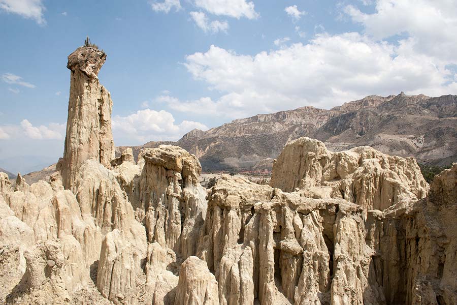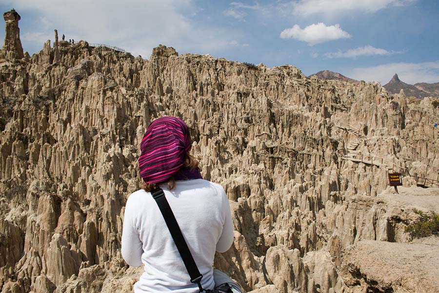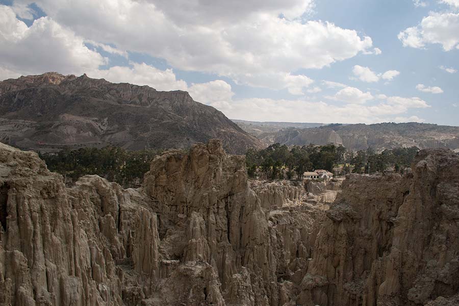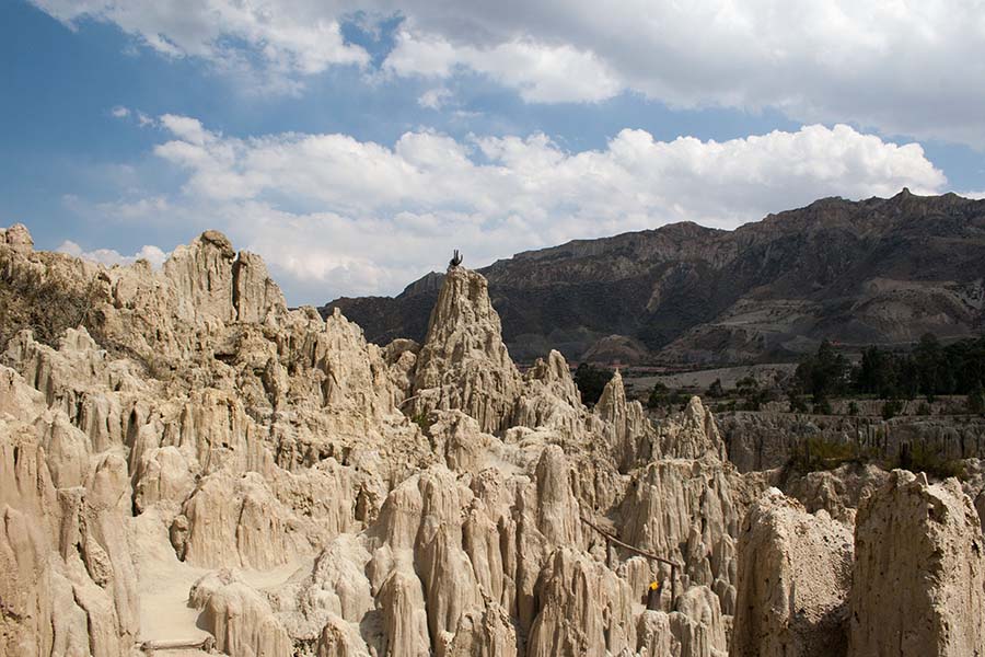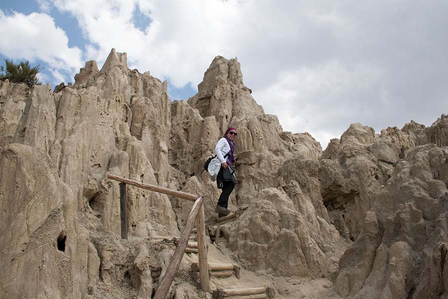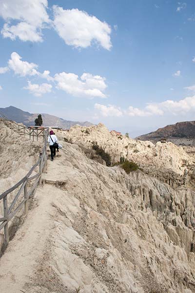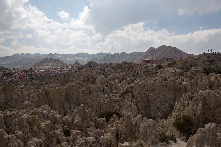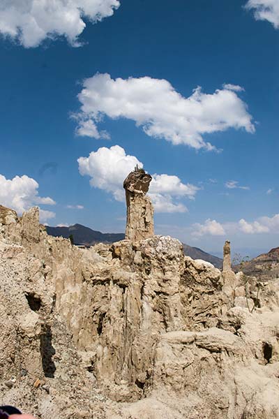 Nous continuons un peu dans la rocaille et la neige pour avoir un autre point de vue. C’est très beau, on se sent tout petit. On doit repartir en empruntant le même chemin, je me suis demandé si le van n’allait pas se disloquer à cause de la piste ! Nous traversons La Paz vers le sud et donc le bas (en altitude) vers la vallée de la Lune. C’est une formation géologique résultant de l’érosion de couches de terre, poussières et cendres volcaniques. La visite est assez courte mais intéressante. C’est lunaire. Effectivement beaucoup de crevasses, de colonnes… Ensuite le van repart et nous dépose au téléphérique avec lequel nous faisons un aller/retour sur les hauteurs de La Paz, ce qui nous permet d’apprécier l’étendue de la ville !