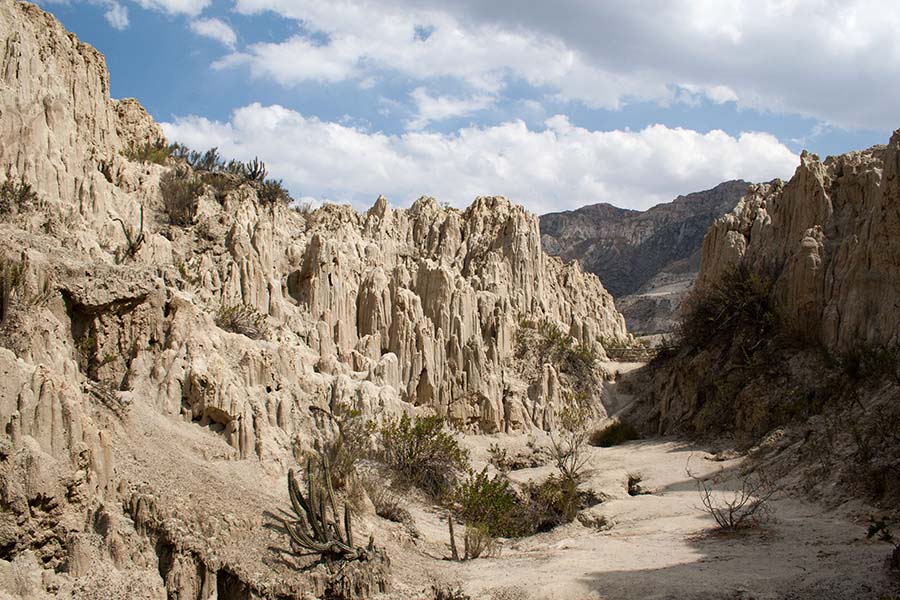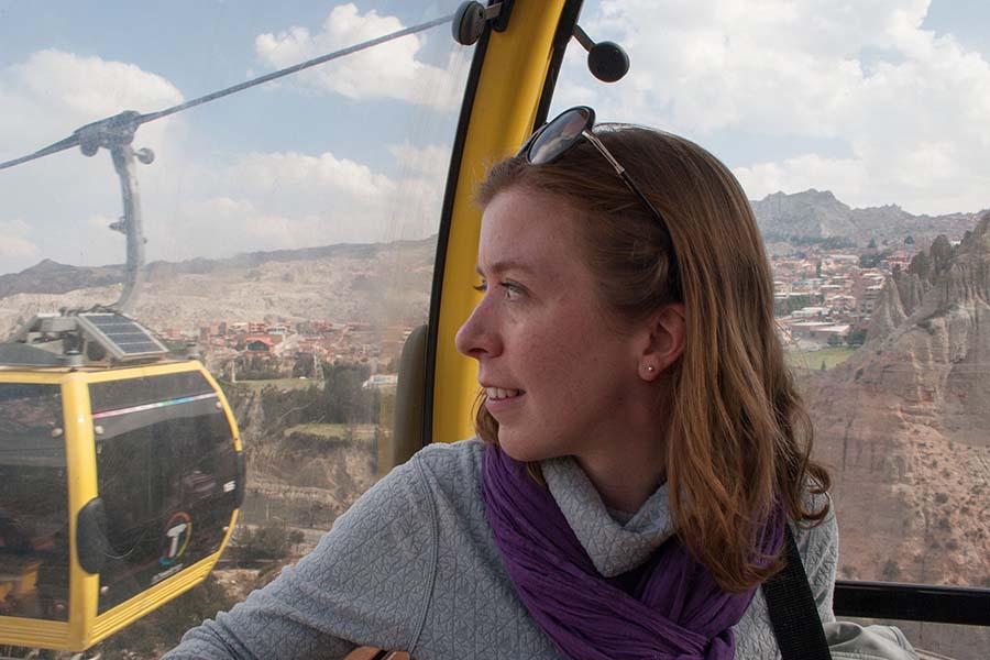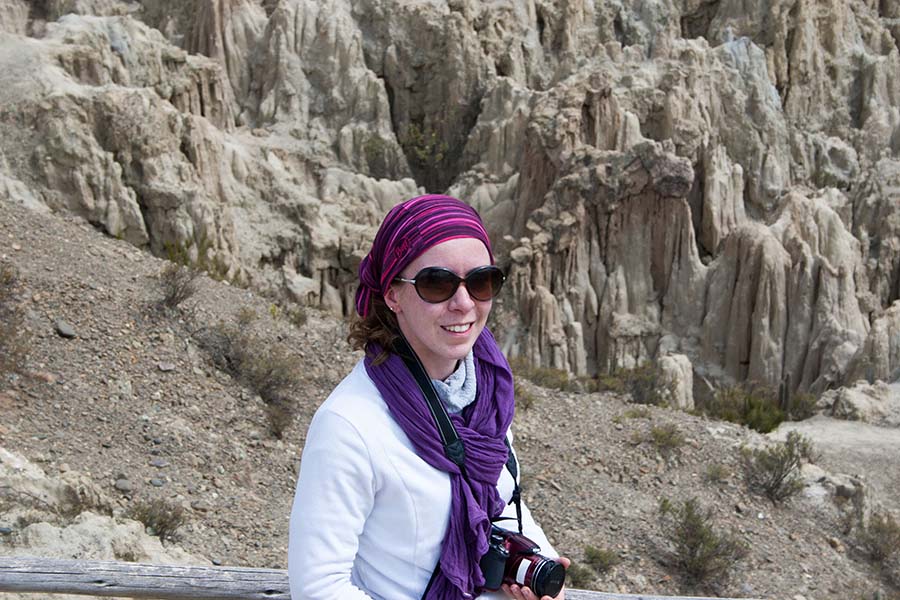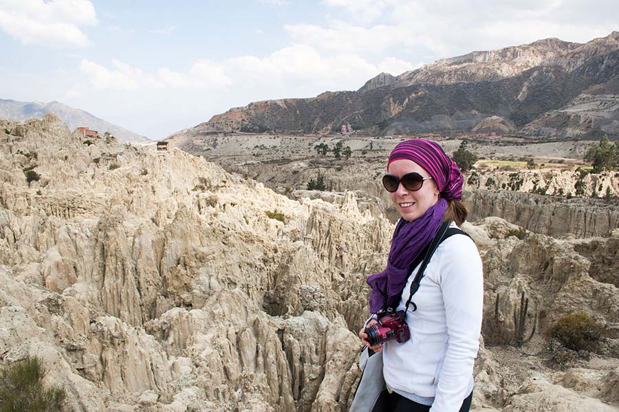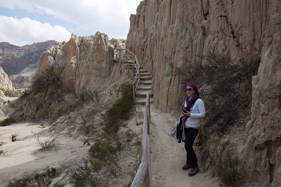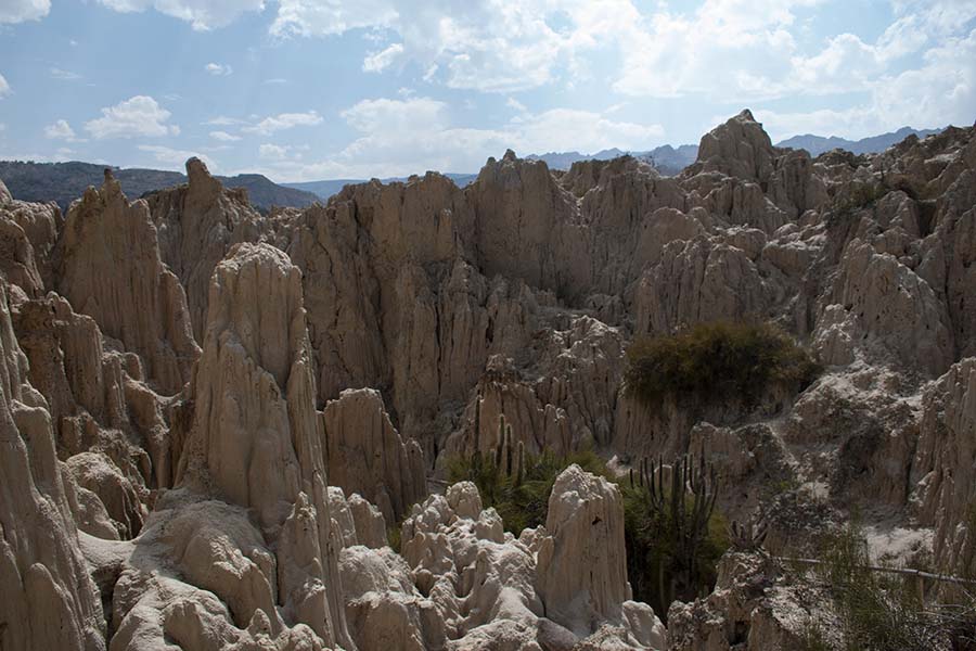 Nous continuons un peu dans la rocaille et la neige pour avoir un autre point de vue. C’est très beau, on se sent tout petit. On doit repartir en empruntant le même chemin, je me suis demandé si le van n’allait pas se disloquer à cause de la piste ! Nous traversons La Paz vers le sud et donc le bas (en altitude) vers la vallée de la Lune. C’est une formation géologique résultant de l’érosion de couches de terre, poussières et cendres volcaniques. La visite est assez courte mais intéressante. C’est lunaire. Effectivement beaucoup de crevasses, de colonnes… Ensuite le van repart et nous dépose au téléphérique avec lequel nous faisons un aller/retour sur les hauteurs de La Paz, ce qui nous permet d’apprécier l’étendue de la ville !