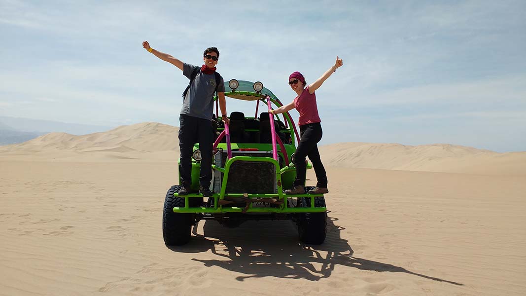 A 10h nous sommes prêts pour la sortie en buggy. C’est à en couper le souffle ! La beauté du désert, les sensations dans le buggy sautant les dunes... c’est juste incroyable. Le pompon : le sandboard ! Faire du « surf/snow » sur le sable à plat ventre, c’est inédit et tellement fou ! On s’est bien amusé avec Rominou. Les photos et vidéos en témoigneront...