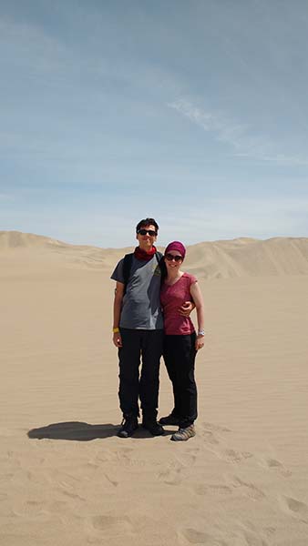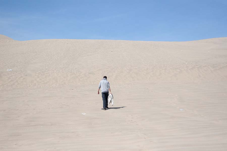 Arrive 10h, nous partons enfin direction les dunes en 4x4 façon madmax. Nous découvrons un paysage qui est bien plus étendu et vaste que nous pensions hier soir. Le sable et les dunes s’étendent à perte de vue, c’est à la fois minéral, vide, lunaire et magnifique. Il ne fait pas si chaud que ça pour le moment mais on sent que le soleil tape déjà très fort. Vient l’heure du sandboard, c’est rigolo, absolument pas dangereux. Il ne faut juste pas manger trop de sable. Plusieurs descentes sont au programme. Des petites et des grandes, on a bien rigolé et fait de belles prises de vues ! Cela nous permet de bien apprécier la hauteur des dunes. On doit sur certaine bien atteindre les 1000 mètres d’altitude, c’est réellement impressionnant !